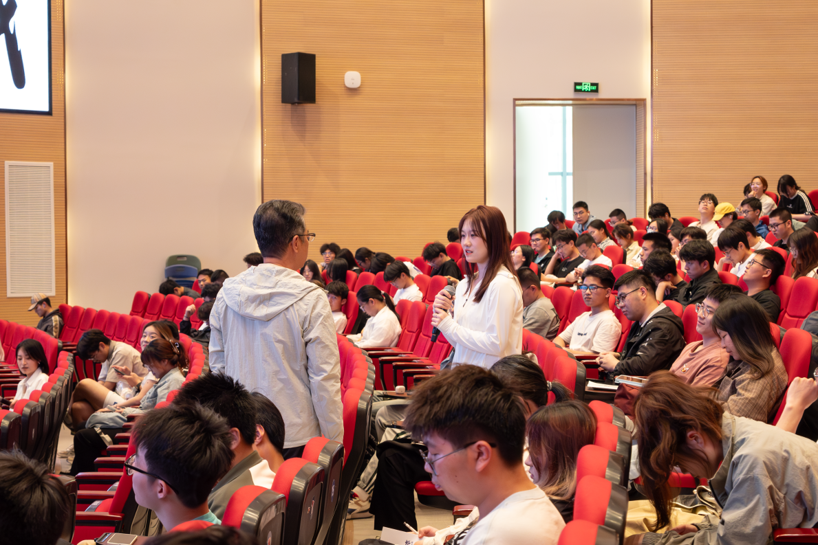 在讲座的互动环节中,郝光老师与同学们进行了亲切的交流。他提出了一个问题——在座同学中是否有愿意到西藏新疆等地区参加支教工作的。一位女同学引起了郝老师注意。“她是最快举手的,并且没有动摇。”被这颗赤子之心打动的郝老师,走下舞台,来到了她身边,听她讲述自己的展望。生于西北,情系家国。不止这位同学,在全中国,还有许多的青年人投身于偏远地区的支教工作,在那里扎根驻守,在教育的穷乡僻壤中开出希望之花。青年力量从来都是中国发展的中流砥柱,这就是青春的“美”。他鼓励大家要敢于追求自己的梦想,勇于面对挑战,用艺术的力量去传递爱与正能量。